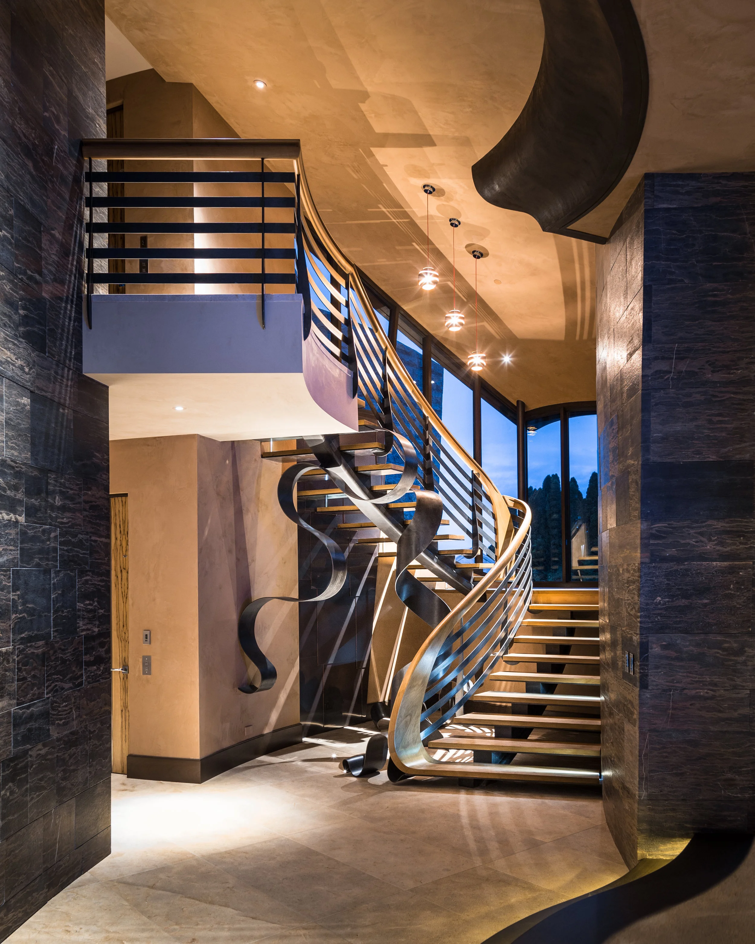 Blackened steel monostringers, bleached American Walnut treads and handrail handsomely frame a blackened steel curved railing system with custom laser cut steel stanchions. Ribbons of steel that are integral to the stair treads on the upper flight add moments of flair and beauty to this shop-built, site assembled stair.